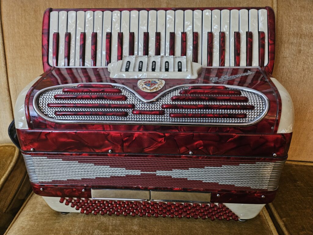 This accordion was sold by the Accordion Connection in Concord NH. He had them made by Serenelline in Italy to his specifications. It is a very well made accordion with great sound. The key board and bass mechanism are smooth and quiet. This accordion looks, feels, and sounds like new but it isn’t. It comes with a case and a 2 year warranty.